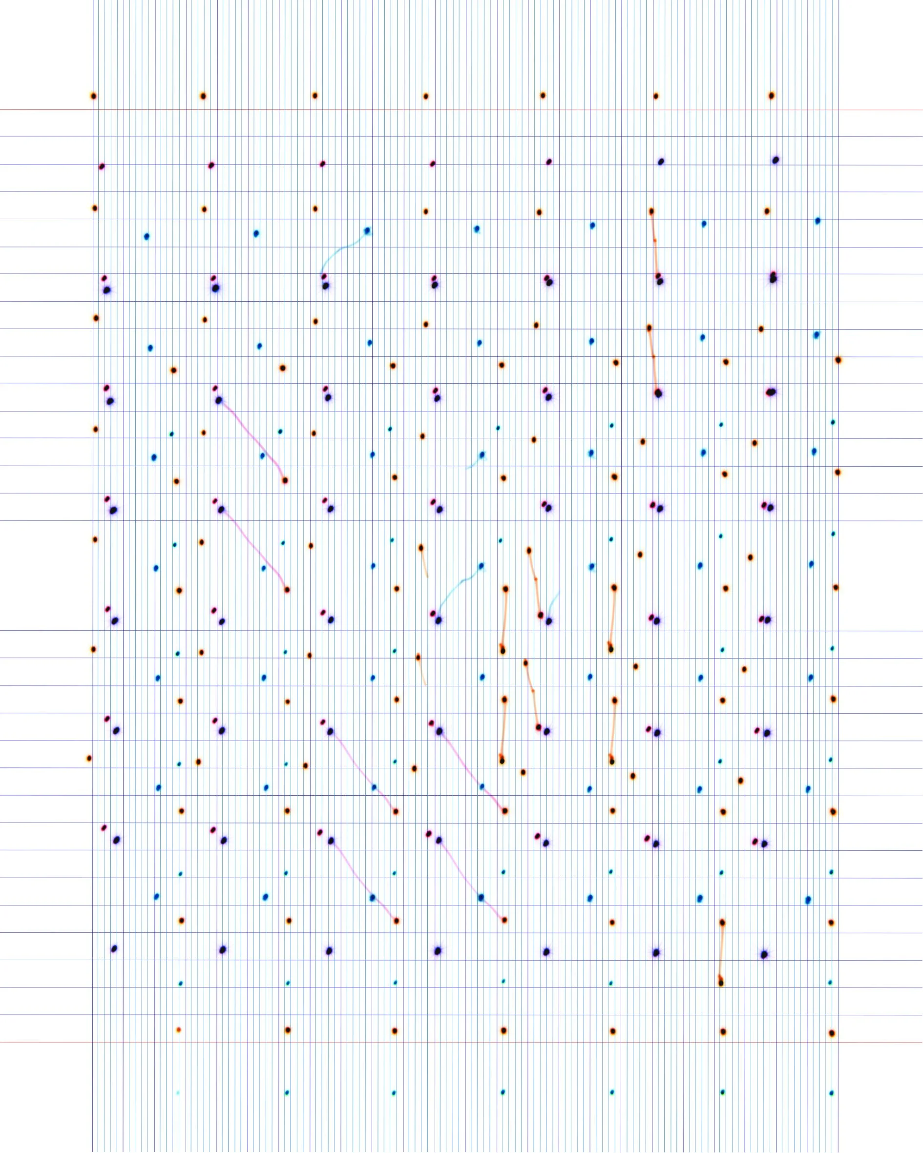 Abstraction plays a central role, stemming from a desire to organize the visual expressions of the process into fundamental elements, lines and points, that relate to one another not only spatially but also temporally. This approach is strongly informed by the language of musical composition. From a formal perspective, the intervals between these expressions of the process, understood as spaces of comparison, become more significant than the images themselves.